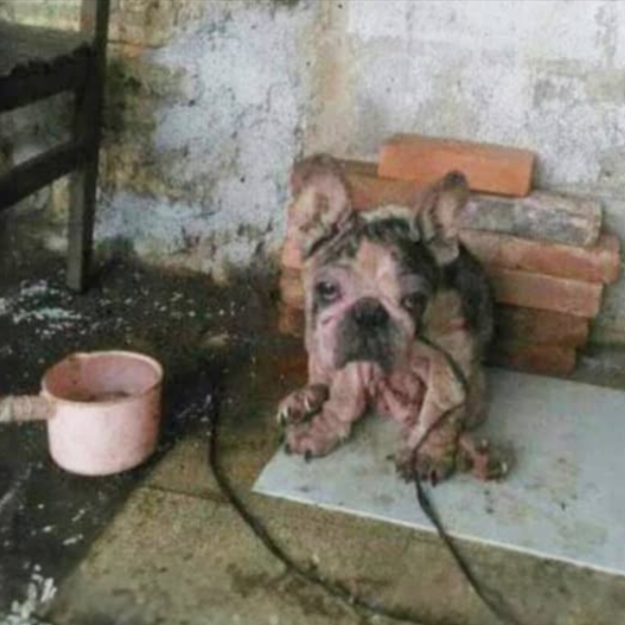 Этот маленький бульдог выглядел так, будто уже принял решение ничего не ждать и ни на что не рассчитывать, словно жизнь для него давно превратилась в череду одинаковых часов, наполненных холодом, одиночеством и пустотой. Его тело говорило о пережитом без слов, но сильнее всего говорил взгляд — не жалобный, не испуганный, не злой, а какой-то выцветший, будто из него вымыло всё живое, оставив лишь тихое присутствие в мире, который давно отвернулся.