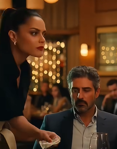 В зале стало по-настоящему тихо. Даже звон бокалов будто исчез. Официантка медленно повернула голову. Слова не сразу дошли до неё, но когда смысл наконец настиг, лицо изменилось. Самоуверенность исчезла, будто её стерли. Губы приоткрылись, пальцы дрогнули.