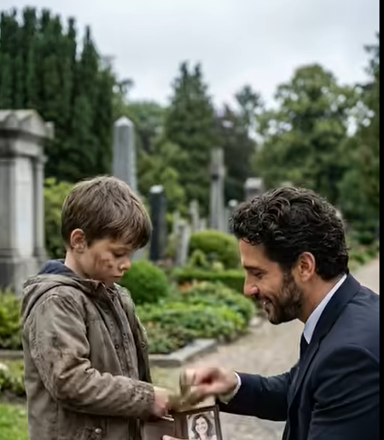 Мальчик лезет в карман своей куртки и достает точно такую же фотографию, только немного помятую по краям.