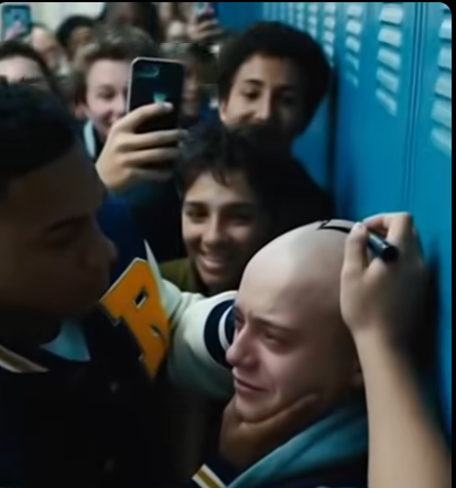 Типичный школьный полдень. Коридор полон учеников, но внимание всех приковано к одной сцене. Местный задира прижал к шкафчику худощавого парня. Парень плачет, его голова абсолютно лысая, и это стало поводом для жестоких шуток. Задира достает черный перманентный маркер.