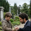 Бизнесмен достает из внутреннего кармана дорогую ручку и кожаную папку с контрактом. Он опускается на одно колено, чтобы быть на одном уровне с мальчиком.