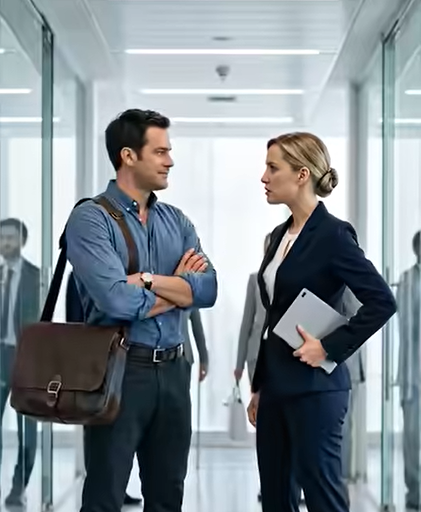 Сверкающий глянцем коридор штаб-квартиры. Елена, успешная женщина в дорогом деловом костюме, уверенно шагает по паркету. Вдруг она замечает Марка — своего бывшего. Он стоит у окна в простой хлопковой рубашке с сумкой-мессенджером через плечо. Елена останавливается, на её лице появляется презрительная ухмылка.